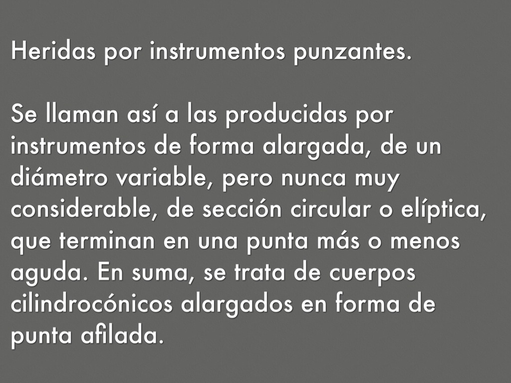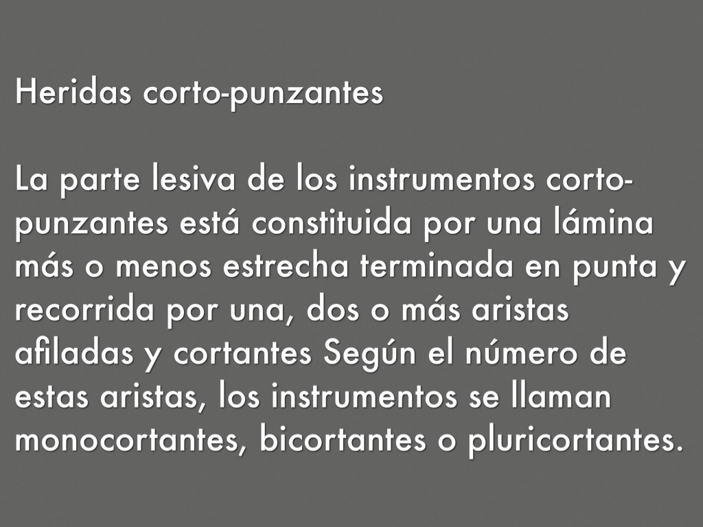 La parte lesiva de los instrumentos corto-punzantes está constituida por una lámina más o menos estrecha terminada en punta y recorrida por una, dos o más aristas afiladas y cortantes Según el número de estas aristas, los instrumentos se llaman monocortantes, bicortantes o pluricortantes.