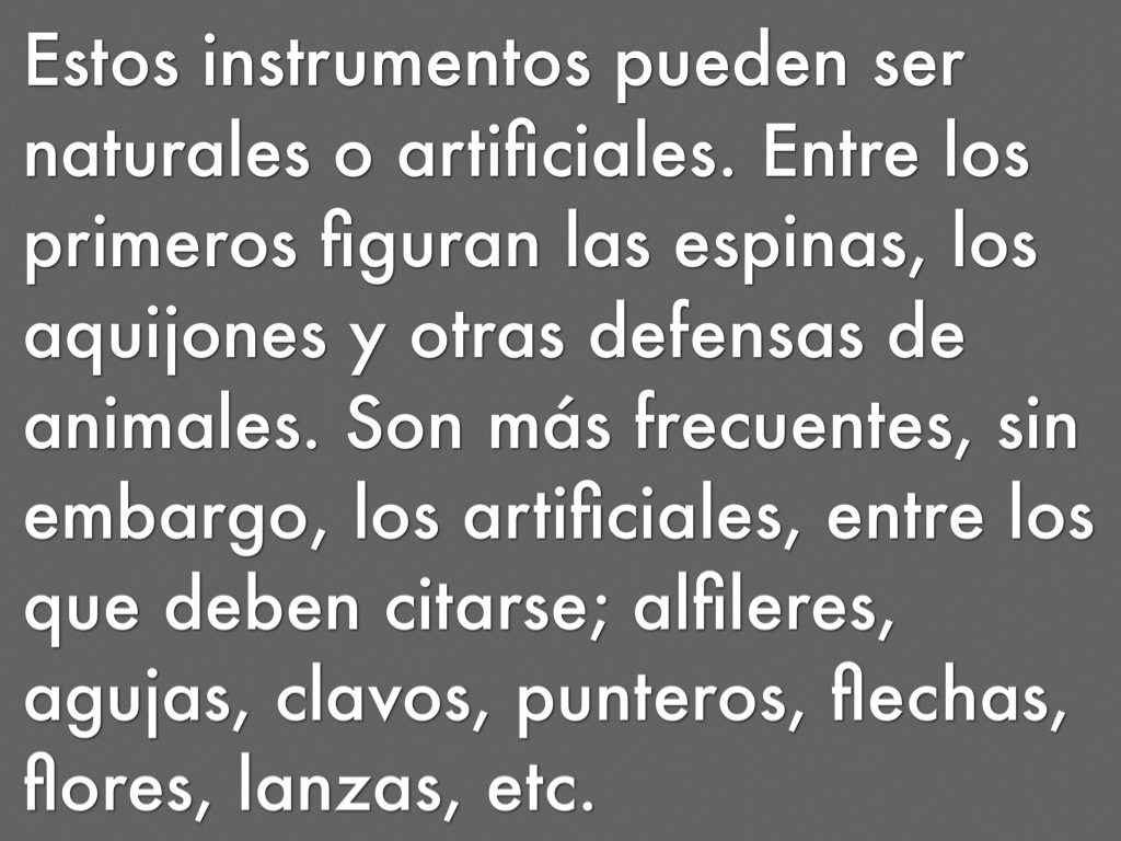 Estos instrumentos pueden ser naturales o artificiales. Entre los primeros figuran las espinas, los aquijones y otras defensas de animales. Son más frecuentes, sin embargo, los artificiales, entre los que deben citarse; alfileres, agujas, clavos, punteros, flechas, flores, lanzas, etc.