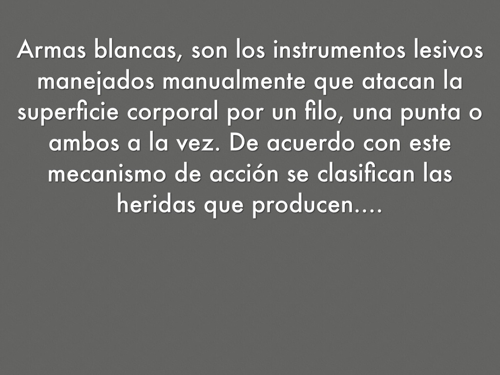 Armas blancas, son los instrumentos lesivos manejados manualmente que atacan la superficie corporal por un filo, una punta o ambos a la vez. De acuerdo con este mecanismo de acción se clasifican las heridas que producen.