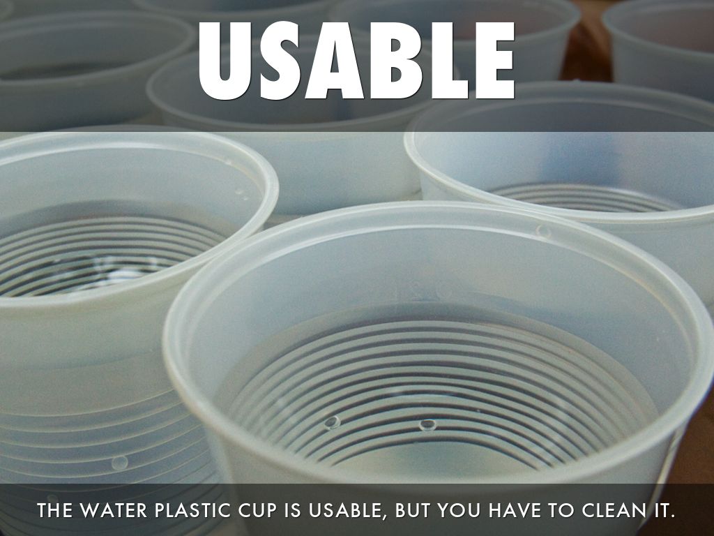 THE WATER PLASTIC CUP IS USABLE, BUT YOU HAVE TO CLEAN IT.
