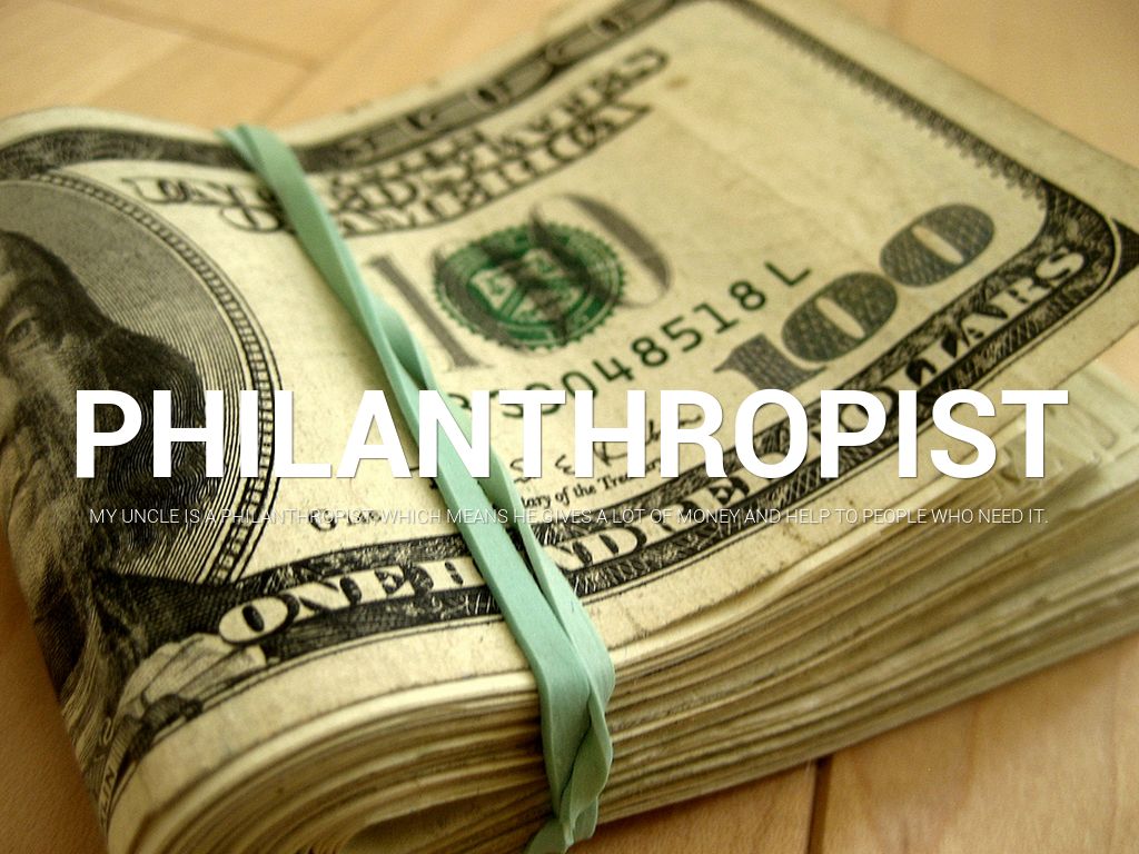 MY UNCLE IS A PHILANTHROPIST, WHICH MEANS HE GIVES A LOT OF MONEY AND HELP TO PEOPLE WHO NEED IT.