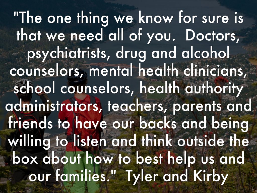 "The one thing we know for sure is that we need all of you. Doctors, psychiatrists, drug and alcohol counselors, mental health clinicians, school counselors, health authority administrators, teachers, parents and friends to have our backs and being willing to listen and think outside the box about how to best help us and our families." Tyler and Kirby