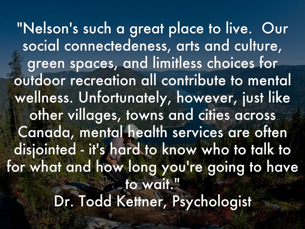 "Nelson's such a great place to live. Our social connectedeness, arts and culture, green spaces, and limitless choices for outdoor recreation all contribute to mental wellness. Unfortunately, however, just like other villages, towns and cities across Canada, mental health services are often disjointed - it's hard to know who to talk to for what and how long you're going to have to wait."