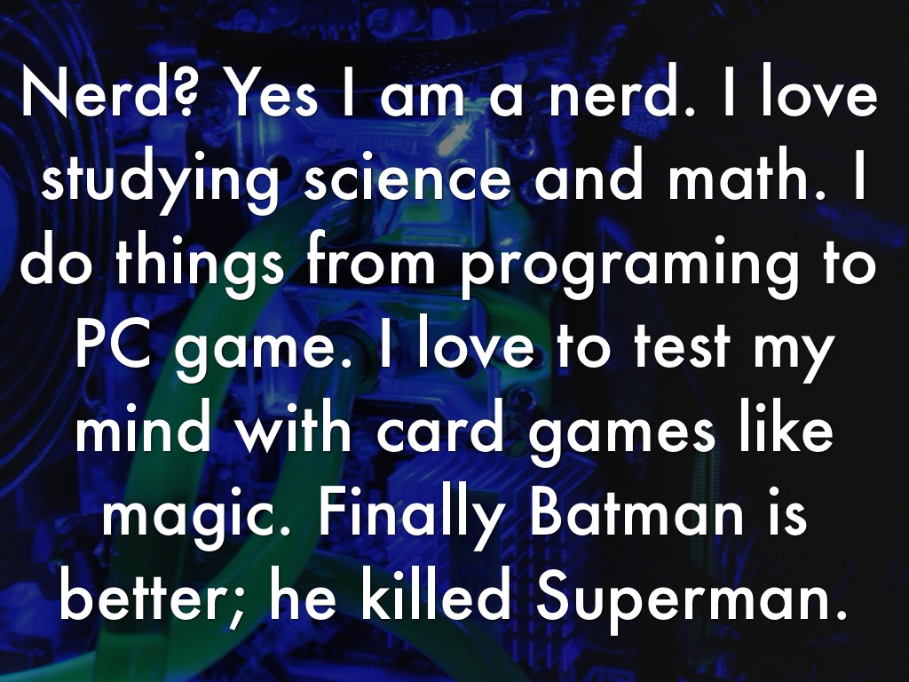 Nerd? Yes I am a nerd. I love studying science and math. I do things from programing to PC game. I love to test my mind with card games like magic. Finally Batman is better; he killed Superman.
