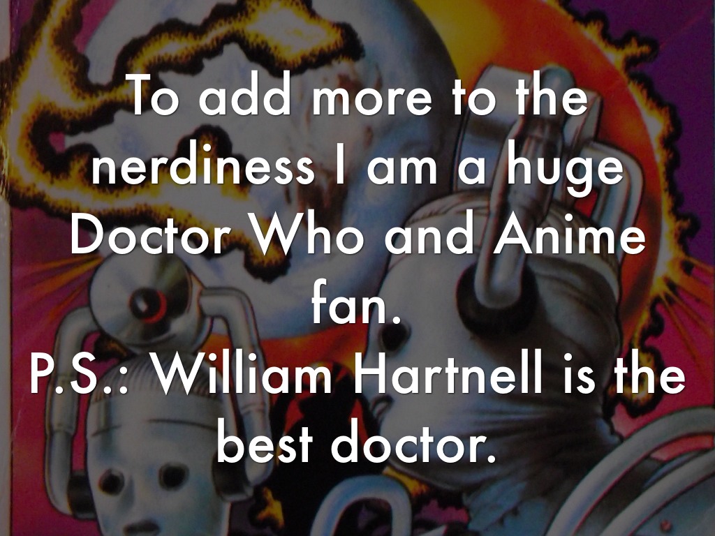 To add more to the nerdiness I am a huge Doctor Who and Anime fan.
