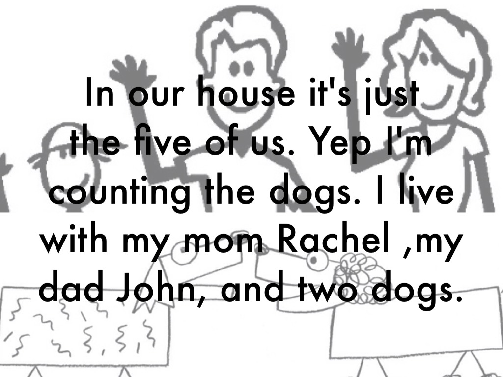 the five of us. Yep I'm counting the dogs. I live with my mom Rachel ,my dad John, and two dogs.