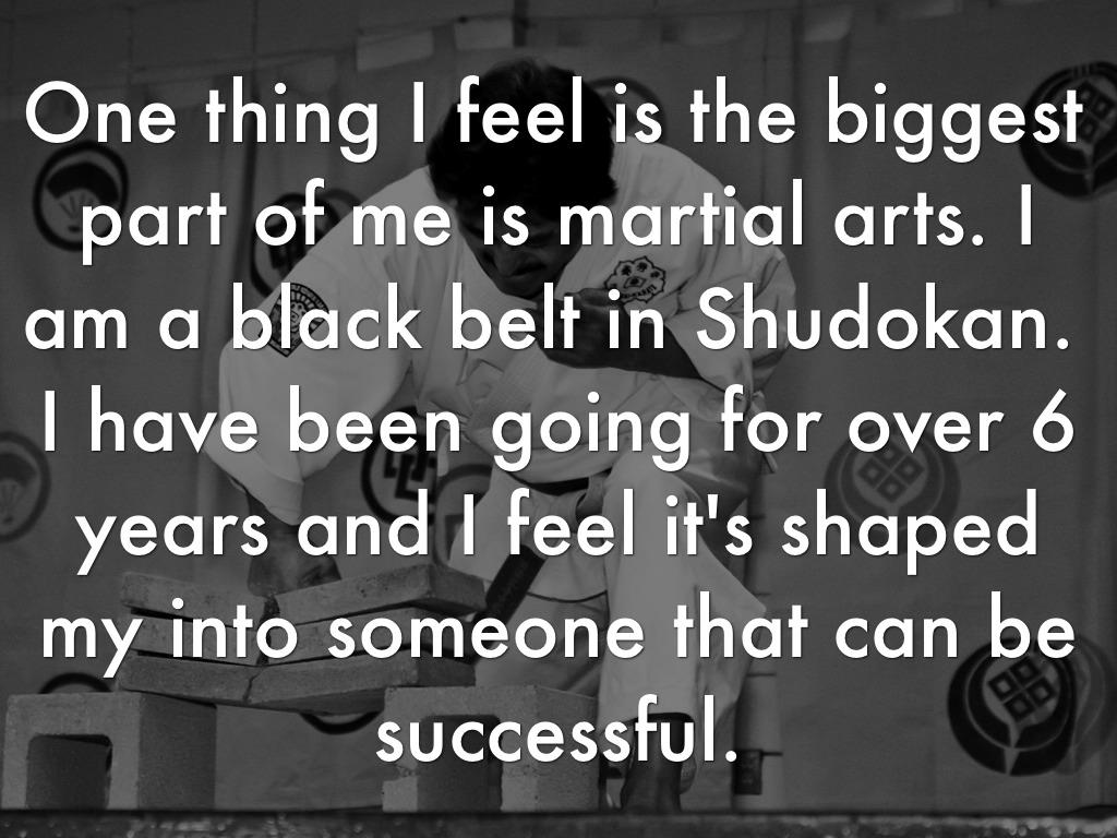 One thing I feel is the biggest part of me is martial arts. I am a black belt in Shudokan. I have been going for over 6 years and I feel it's shaped my into someone that can be successful.