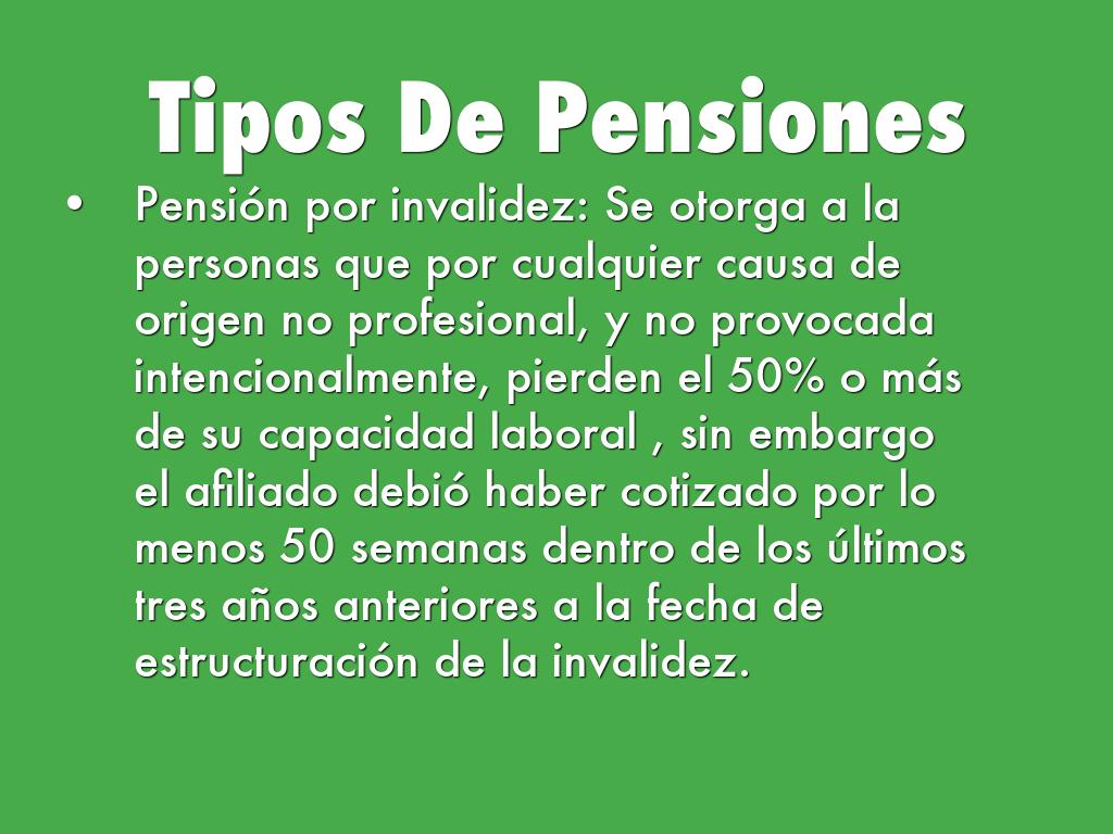 Pensión por invalidez: Se otorga a la personas que por cualquier causa de origen no profesional, y no provocada intencionalmente, pierden el 50% o más de su capacidad laboral , sin embargo el afiliado debió haber cotizado por lo menos 50 semanas dentro de los últimos tres años anteriores a la fecha de estructuración de la invalidez.