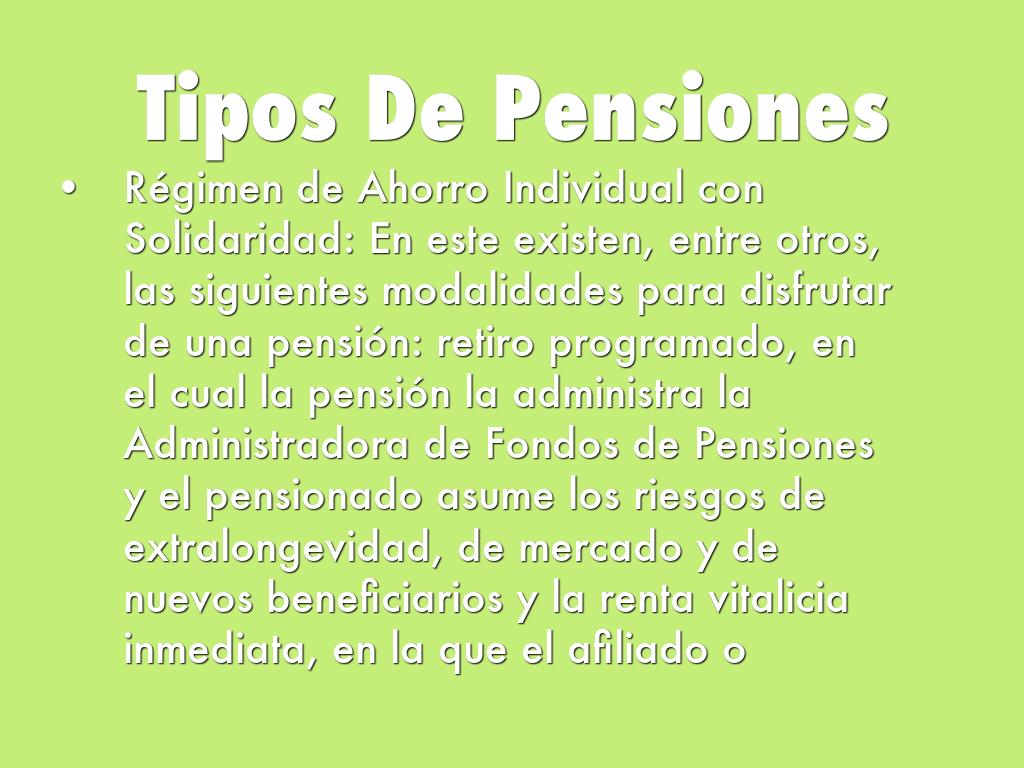 Régimen de Ahorro Individual con Solidaridad: En este existen, entre otros, las siguientes modalidades para disfrutar de una pensión: retiro programado, en el cual la pensión la administra la Administradora de Fondos de Pensiones y el pensionado asume los riesgos de extralongevidad, de mercado y de nuevos beneficiarios y la renta vitalicia inmediata, en la que el afiliado o beneficiario contrata directa e irrevocablemente con una aseguradora el pago de una renta mensual hasta su fallecimiento.