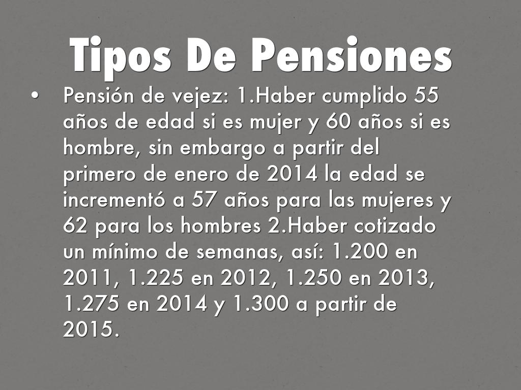 Pensión de vejez: 1.Haber cumplido 55 años de edad si es mujer y 60 años si es hombre, sin embargo a partir del primero de enero de 2014 la edad se incrementó a 57 años para las mujeres y 62 para los hombres 2.Haber cotizado un mínimo de semanas, así: 1.200 en 2011, 1.225 en 2012, 1.250 en 2013, 1.275 en 2014 y 1.300 a partir de 2015.