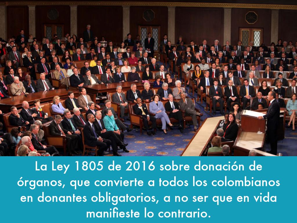 La Ley 1805 de 2016 sobre donación de órganos, que convierte a todos los colombianos en donantes obligatorios, a no ser que en vida manifieste lo contrario.