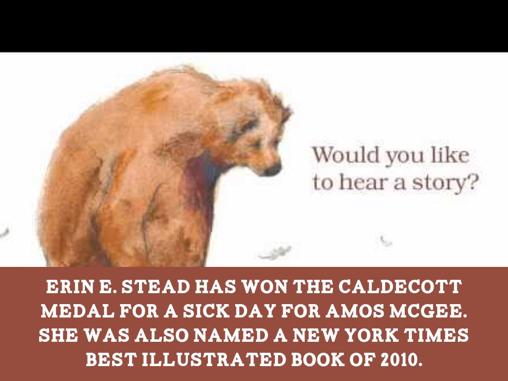 Erin e. Stead has won the Caldecott Medal for A Sick Day for Amos McGee. She was also named a New York Times Best Illustrated Book of 2010.