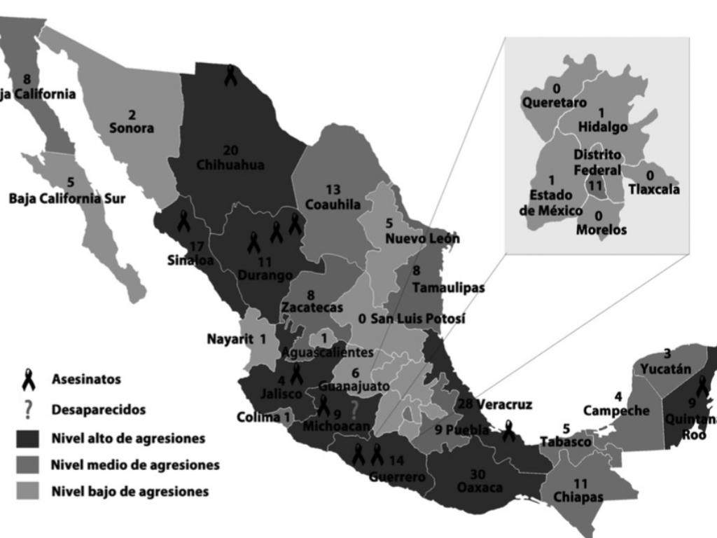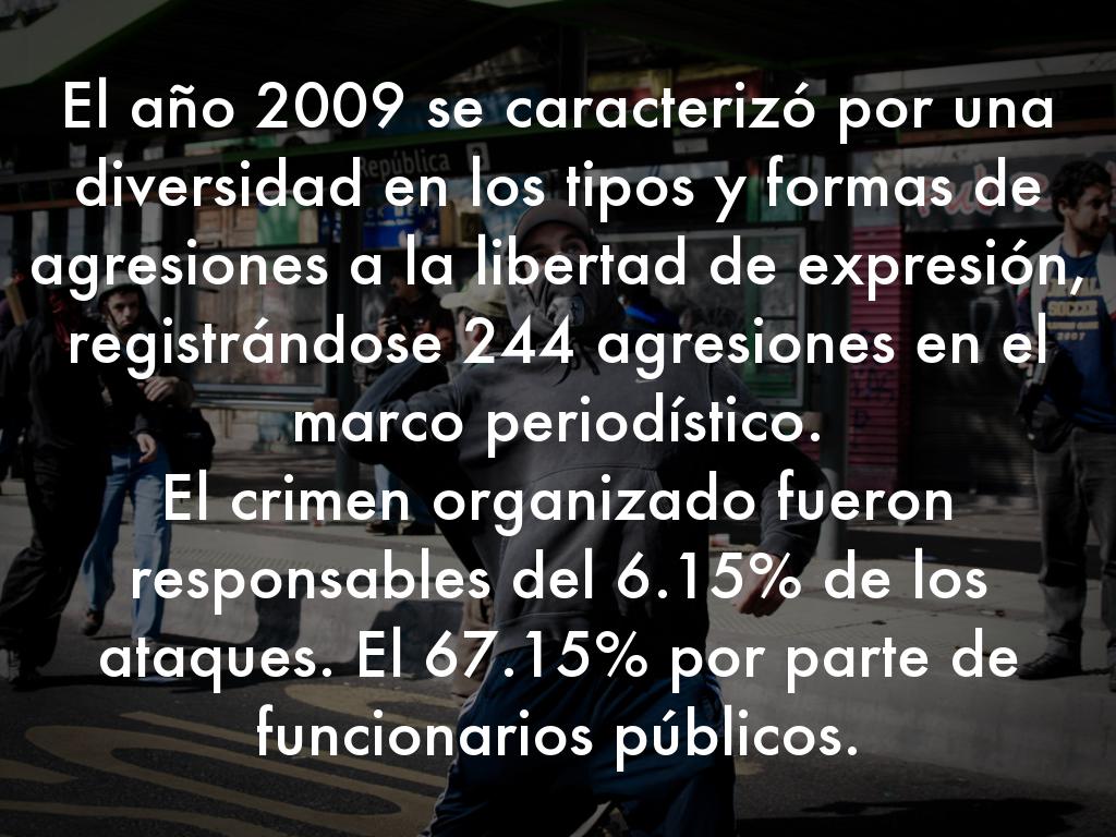 El año 2009 se caracterizó por una diversidad en los tipos y formas de agresiones a la libertad de expresión, registrándose 244 agresiones en el marco periodístico. El crimen organizado fueron responsables del 6.15% de los ataques. El 67.15% por parte de funcionarios públicos.