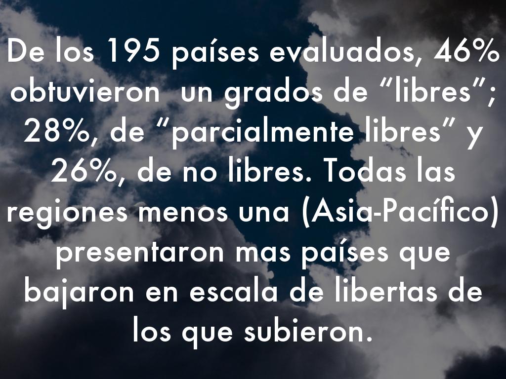 De los 195 países evaluados, 46% obtuvieron un grados de “libres”; 28%, de “parcialmente libres” y 26%, de no libres. Todas las regiones menos una (Asia-Pacífico) presentaron mas países que bajaron en escala de libertas de los que subieron.