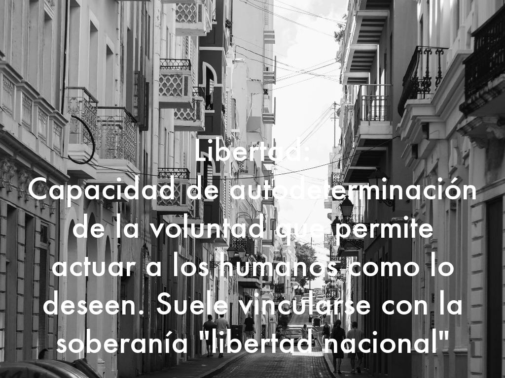 Libertad: Capacidad de autodeterminación de la voluntad que permite actuar a los humanos como lo deseen. Suele vincularse con la soberanía "libertad nacional"