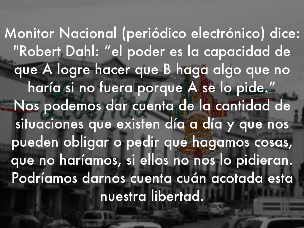 Monitor Nacional (periódico electrónico) dice: "Robert Dahl: “el poder es la capacidad de que A logre hacer que B haga algo que no haría si no fuera porque A se lo pide.” Nos podemos dar cuenta de la cantidad de situaciones que existen día a día y que nos pueden obligar o pedir que hagamos cosas, que no haríamos, si ellos no nos lo pidieran. Podríamos darnos cuenta cuán acotada esta nuestra libertad.