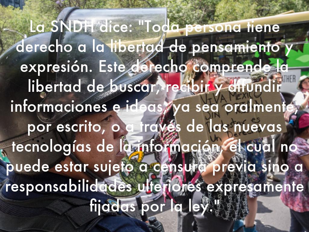 La SNDH dice: "Toda persona tiene derecho a la libertad de pensamiento y expresión. Este derecho comprende la libertad de buscar, recibir y difundir informaciones e ideas, ya sea oralmente, por escrito, o a través de las nuevas tecnologías de la información, el cual no puede estar sujeto a censura previa sino a responsabilidades ulteriores expresamente fijadas por la ley."