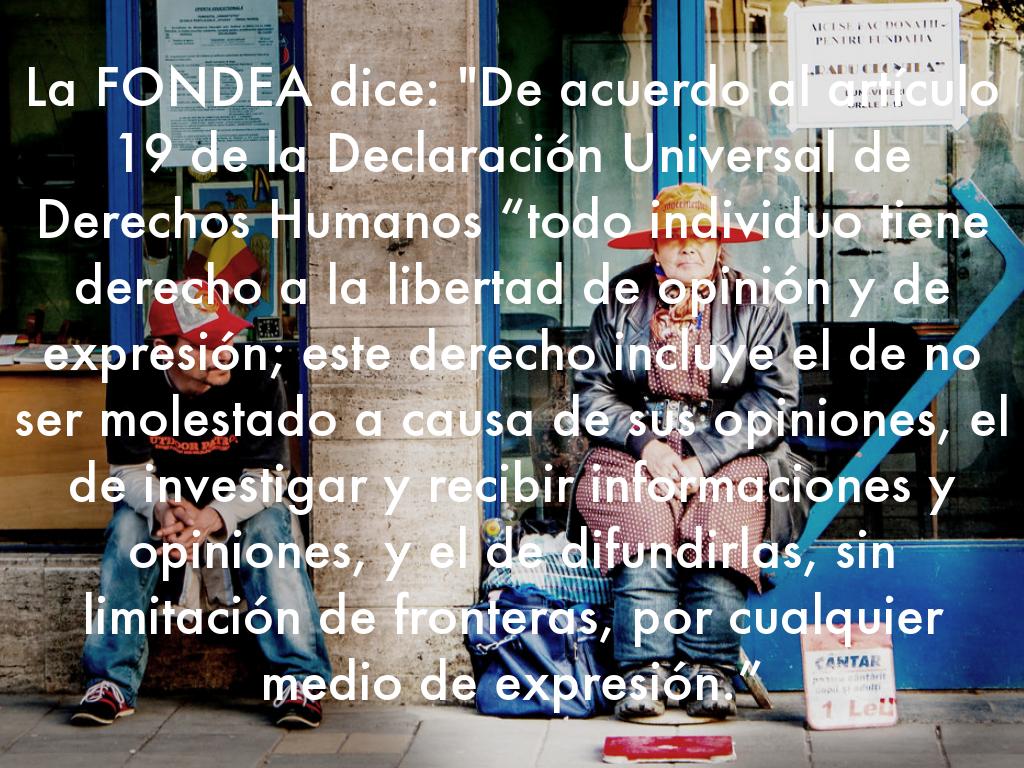 La FONDEA dice: "De acuerdo al artículo 19 de la Declaración Universal de Derechos Humanos “todo individuo tiene derecho a la libertad de opinión y de expresión; este derecho incluye el de no ser molestado a causa de sus opiniones, el de investigar y recibir informaciones y opiniones, y el de difundirlas, sin limitación de fronteras, por cualquier medio de expresión.”