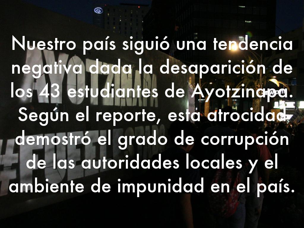 Nuestro país siguió una tendencia negativa dada la desaparición de los 43 estudiantes de Ayotzinapa. Según el reporte, esta atrocidad demostró el grado de corrupción de las autoridades locales y el ambiente de impunidad en el país.