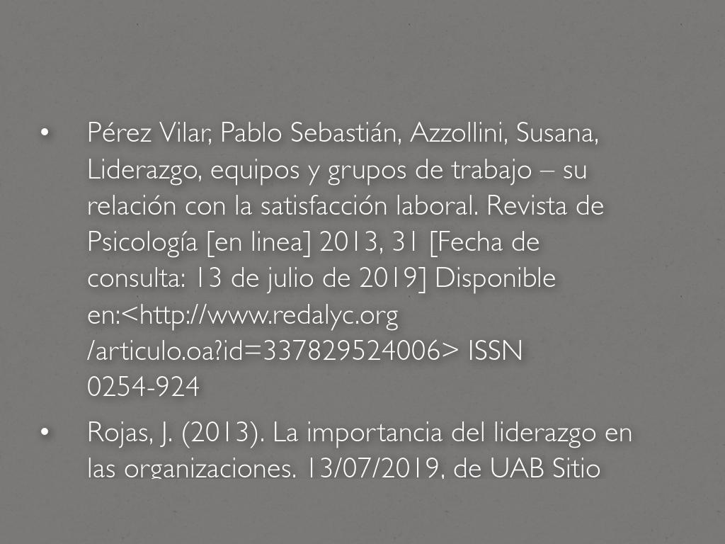 Pérez Vilar, Pablo Sebastián, Azzollini, Susana, Liderazgo, equipos y grupos de trabajo – su relación con la satisfacción laboral. Revista de Psicología [en linea] 2013, 31 [Fecha de consulta: 13 de julio de 2019] Disponible en: ISSN 0254-924