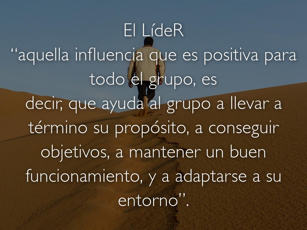 El LídeR “aquella influencia que es positiva para todo el grupo, es decir, que ayuda al grupo a llevar a término su propósito, a conseguir objetivos, a mantener un buen funcionamiento, y a adaptarse a su entorno”.