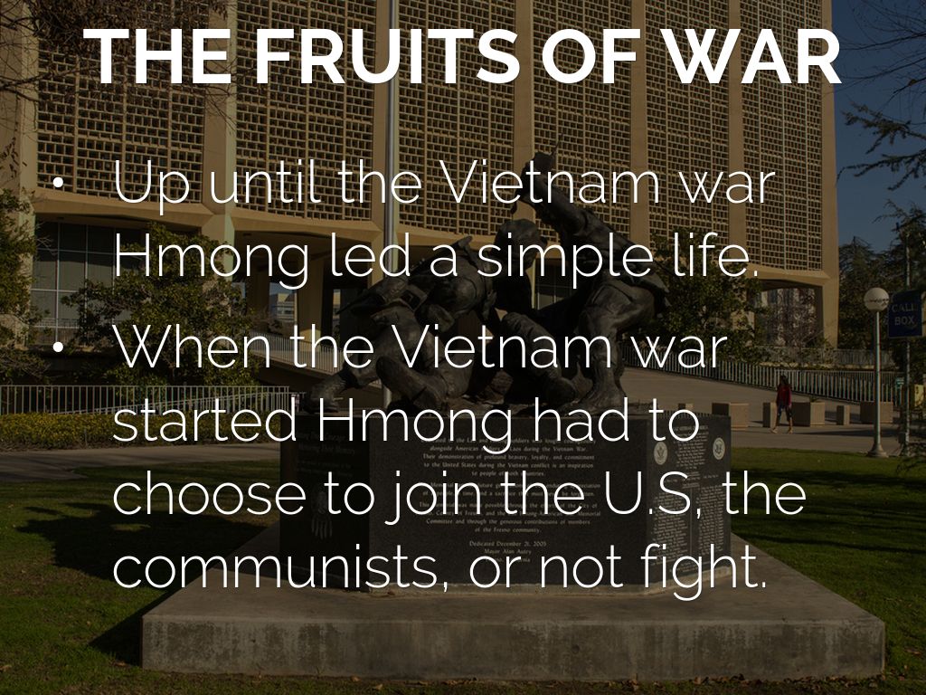 When the Vietnam war started Hmong had to choose to join the U.S, the communists, or not fight.