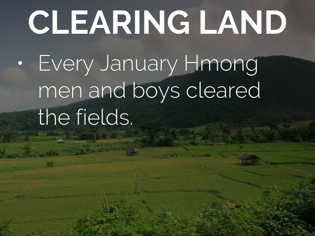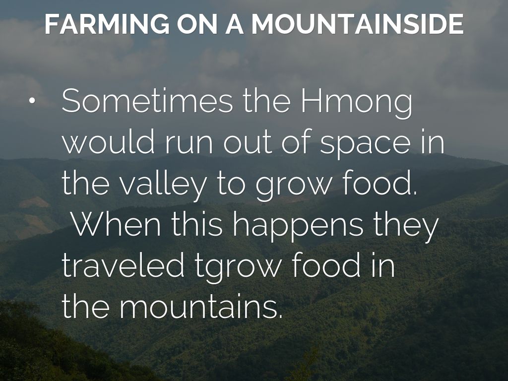Sometimes the Hmong would run out of space in the valley to grow food. When this happens they traveled tgrow food in the mountains.