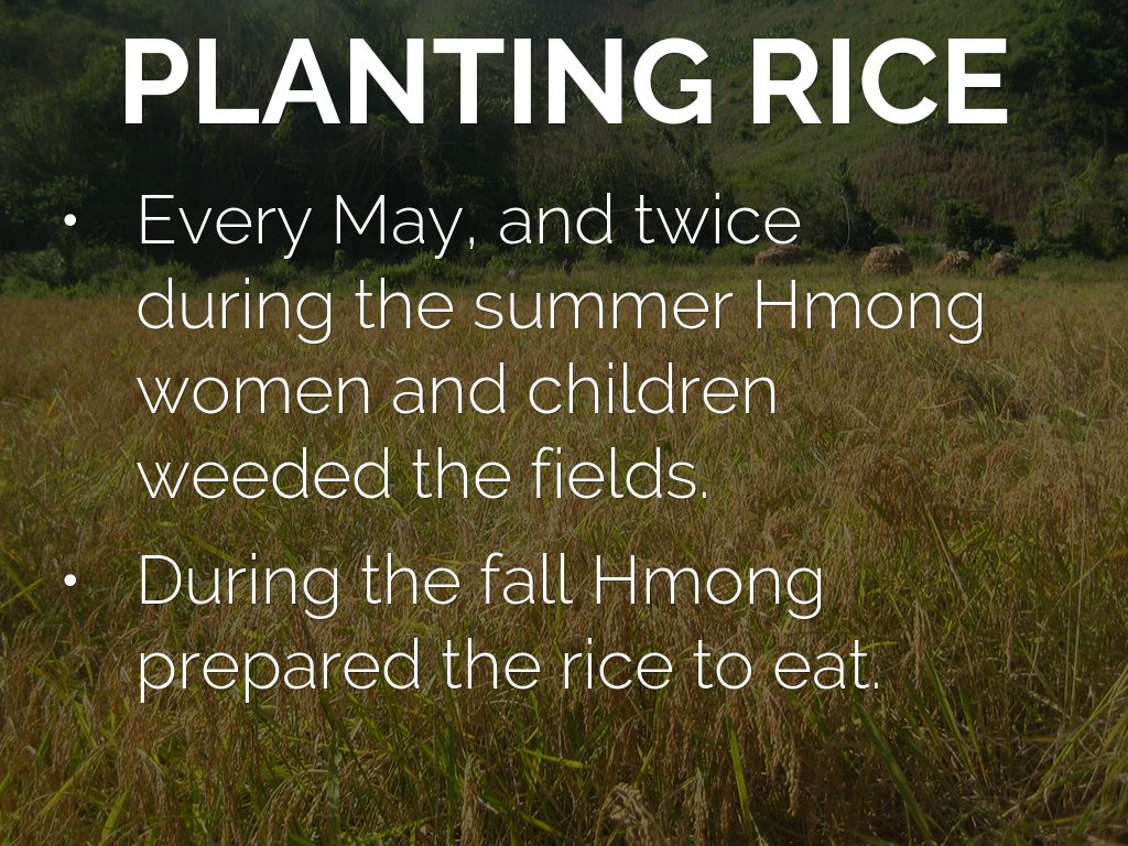 Every May, and twice during the summer Hmong women and children weeded the fields.