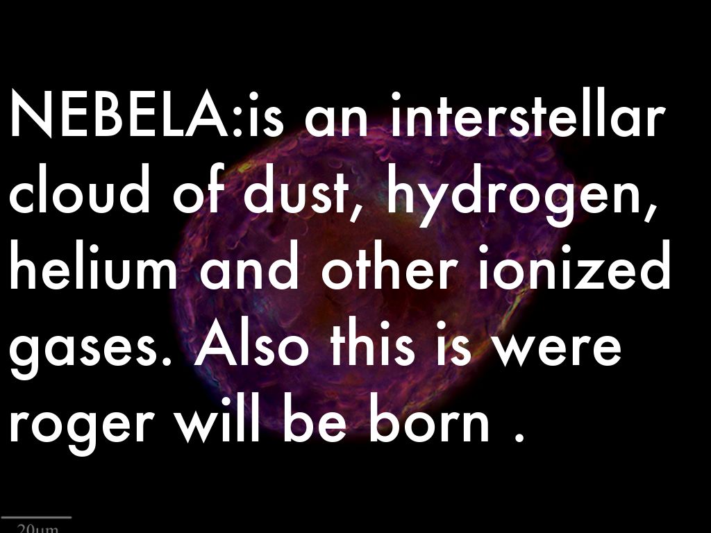 NEBELA:is an interstellar cloud of dust, hydrogen, helium and other ionized gases. Also this is were roger will be born .