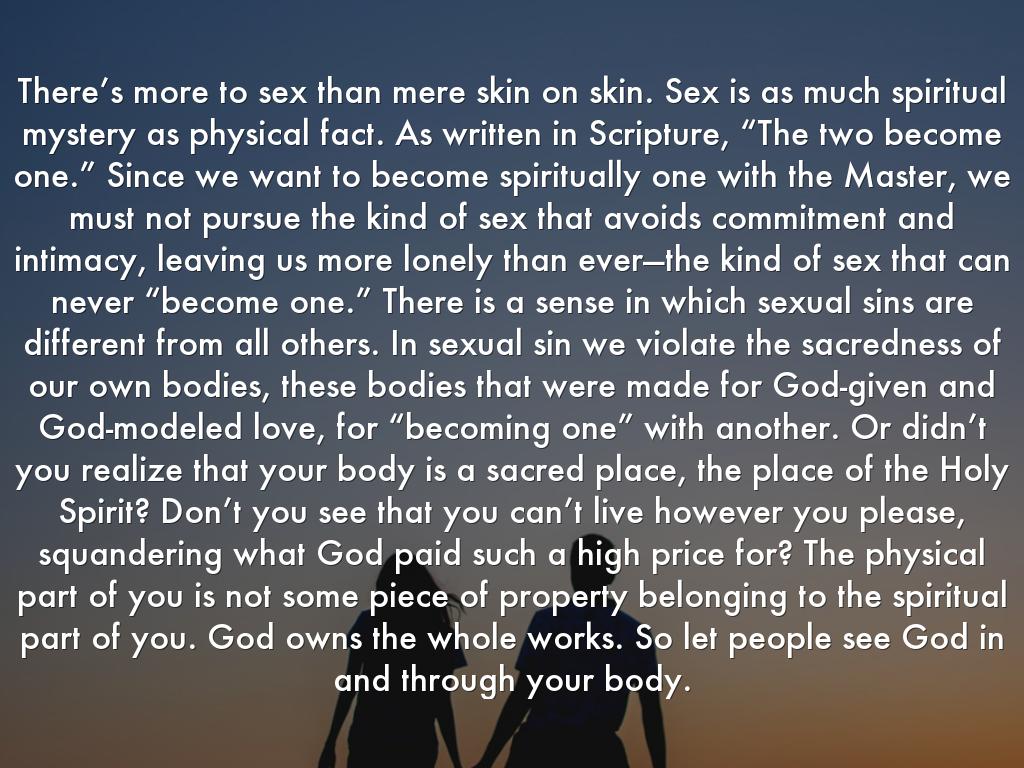 There’s more to sex than mere skin on skin. Sex is as much spiritual mystery as physical fact. As written in Scripture, “The two become one.” Since we want to become spiritually one with the Master, we must not pursue the kind of sex that avoids commitment and intimacy, leaving us more lonely than ever—the kind of sex that can never “become one.” There is a sense in which sexual sins are different from all others. In sexual sin we violate the sacredness of our own bodies, these bodies that were made for God-given and God-modeled love, for “becoming one” with another. Or didn’t you realize that your body is a sacred place, the place of the Holy Spirit? Don’t you see that you can’t live however you please, squandering what God paid such a high price for? The physical part of you is not some piece of property belonging to the spiritual part of you. God owns the whole works. So let people see God in and through your body.