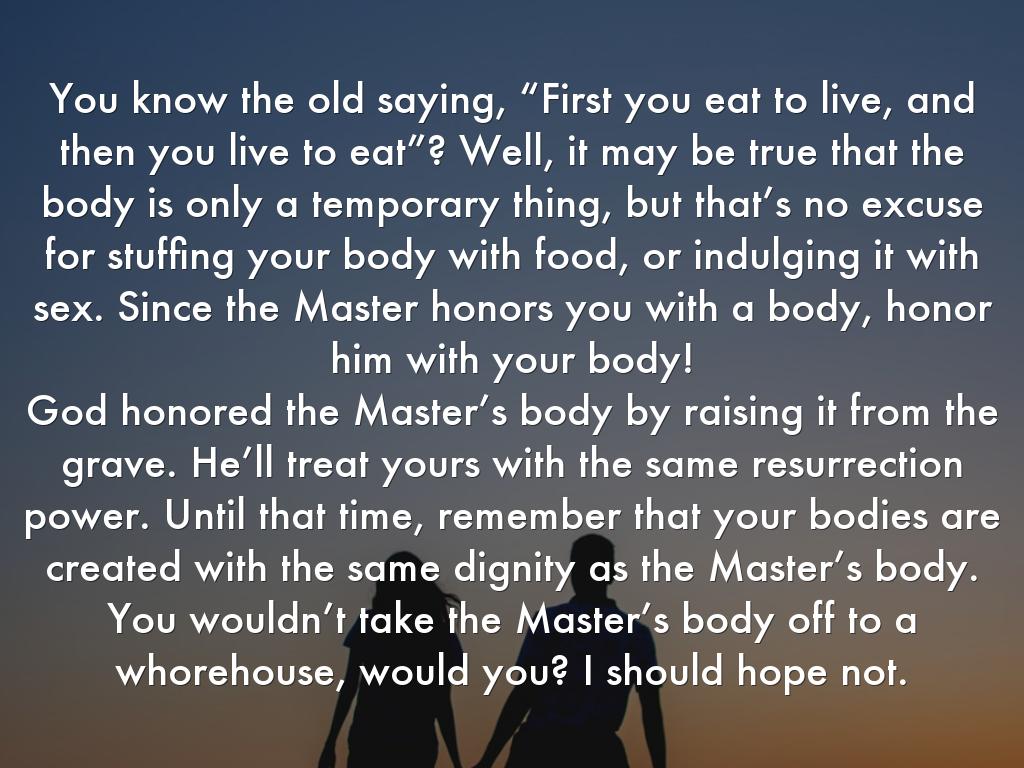 You know the old saying, “First you eat to live, and then you live to eat”? Well, it may be true that the body is only a temporary thing, but that’s no excuse for stuffing your body with food, or indulging it with sex. Since the Master honors you with a body, honor him with your body! God honored the Master’s body by raising it from the grave. He’ll treat yours with the same resurrection power. Until that time, remember that your bodies are created with the same dignity as the Master’s body. You wouldn’t take the Master’s body off to a whorehouse, would you? I should hope not.
