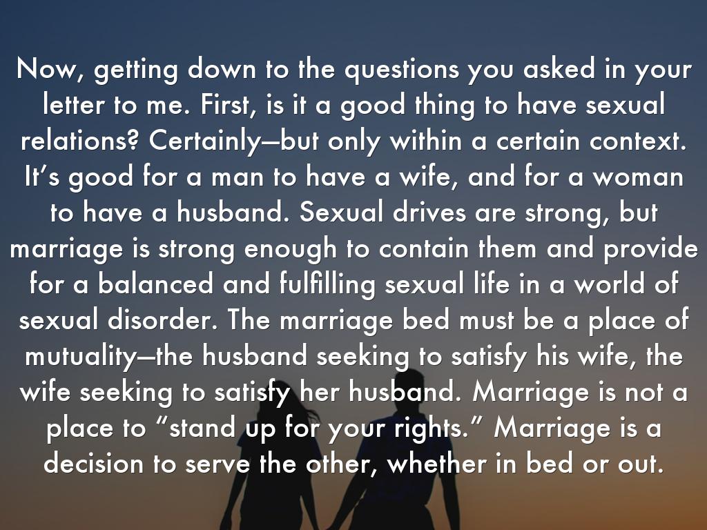 Now, getting down to the questions you asked in your letter to me. First, is it a good thing to have sexual relations? Certainly—but only within a certain context. It’s good for a man to have a wife, and for a woman to have a husband. Sexual drives are strong, but marriage is strong enough to contain them and provide for a balanced and fulfilling sexual life in a world of sexual disorder. The marriage bed must be a place of mutuality—the husband seeking to satisfy his wife, the wife seeking to satisfy her husband. Marriage is not a place to “stand up for your rights.” Marriage is a decision to serve the other, whether in bed or out.