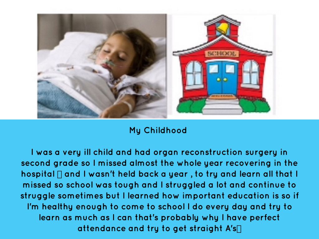 I was a very ill child and had organ reconstruction surgery in second grade so I missed almost the whole year recovering in the hospital π₯ and I wasn't held back a year , to try and learn all that I missed so school was tough and I struggled a lot and continue to struggle sometimes but I learned how important education is so if I'm healthy enough to come to school I do every day and try to learn as much as I can that's probably why I have perfect attendance and try to get straight A'sπ€
