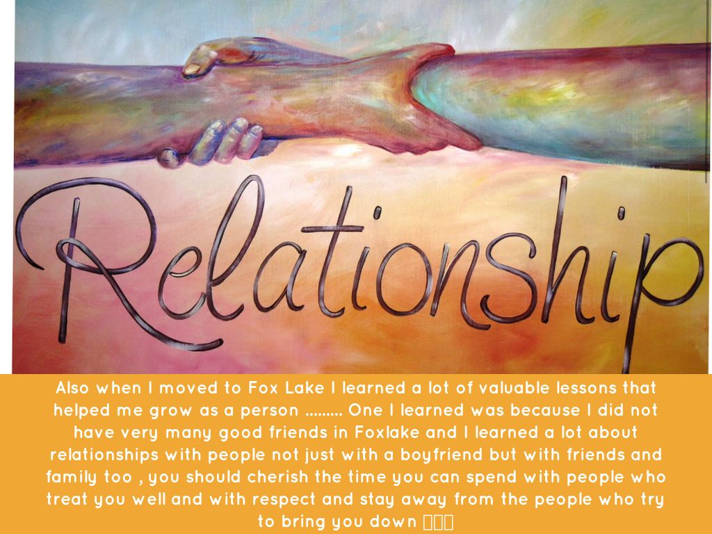 Also when I moved to Fox Lake I learned a lot of valuable lessons that helped me grow as a person ......... One I learned was because I did not have very many good friends in Foxlake and I learned a lot about relationships with people not just with a boyfriend but with friends and family too , you should cherish the time you can spend with people who treat you well and with respect and stay away from the people who try to bring you down π«ππ¬