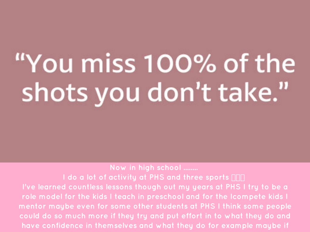 I've learned countless lessons though out my years at PHS I try to be a role model for the kids I teach in preschool and for the Icompete kids I mentor maybe even for some other students at PHS I think some people could do so much more if they try and put effort in to what they do and have confidence in themselves and what they do for example maybe if the other students in my gym class see me run an extra lap they'll do it to :)