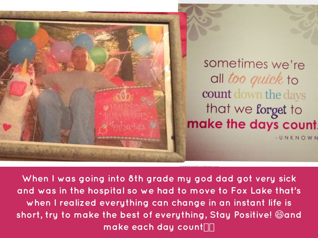 When I was going into 8th grade my god dad got very sick and was in the hospital so we had to move to Fox Lake that's when I realized everything can change in an instant life is short, try to make the best of everything, Stay Positive! πand make each day countππ»