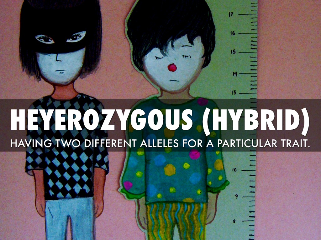 HAVING TWO DIFFERENT ALLELES FOR A PARTICULAR TRAIT.