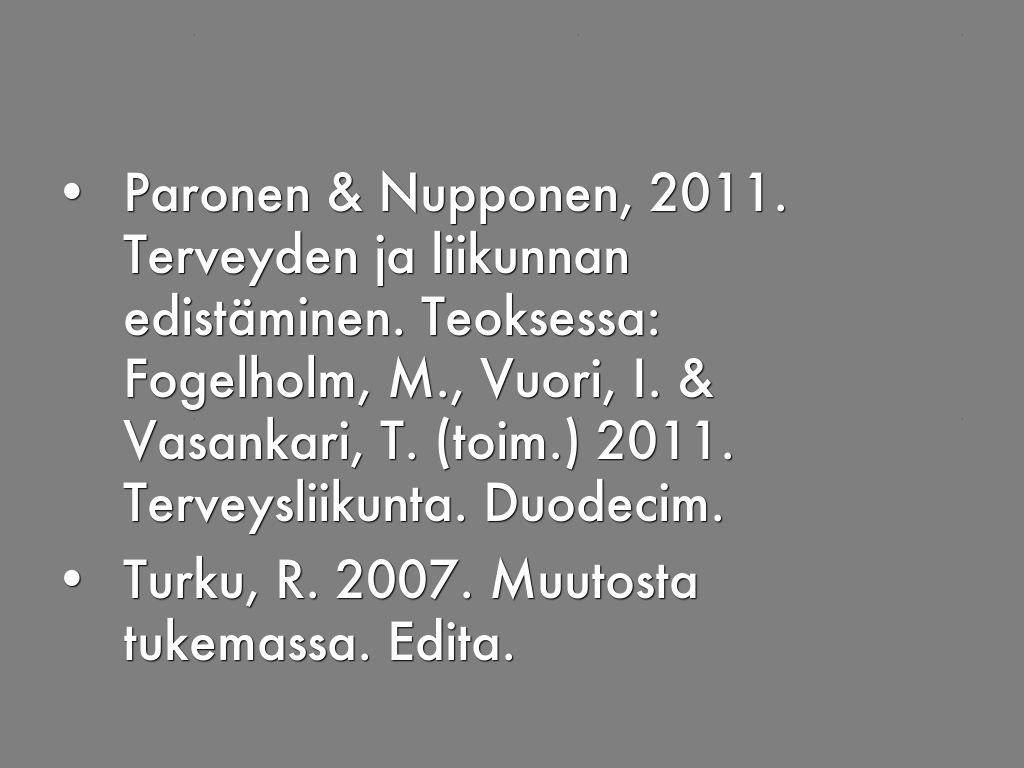 - Paronen & Nupponen, 2011. Terveyden ja liikunnan edistäminen. Teoksessa: Fogelholm, M., Vuori, I. & Vasankari, T. (toim.) 2011. Terveysliikunta. Duodecim.