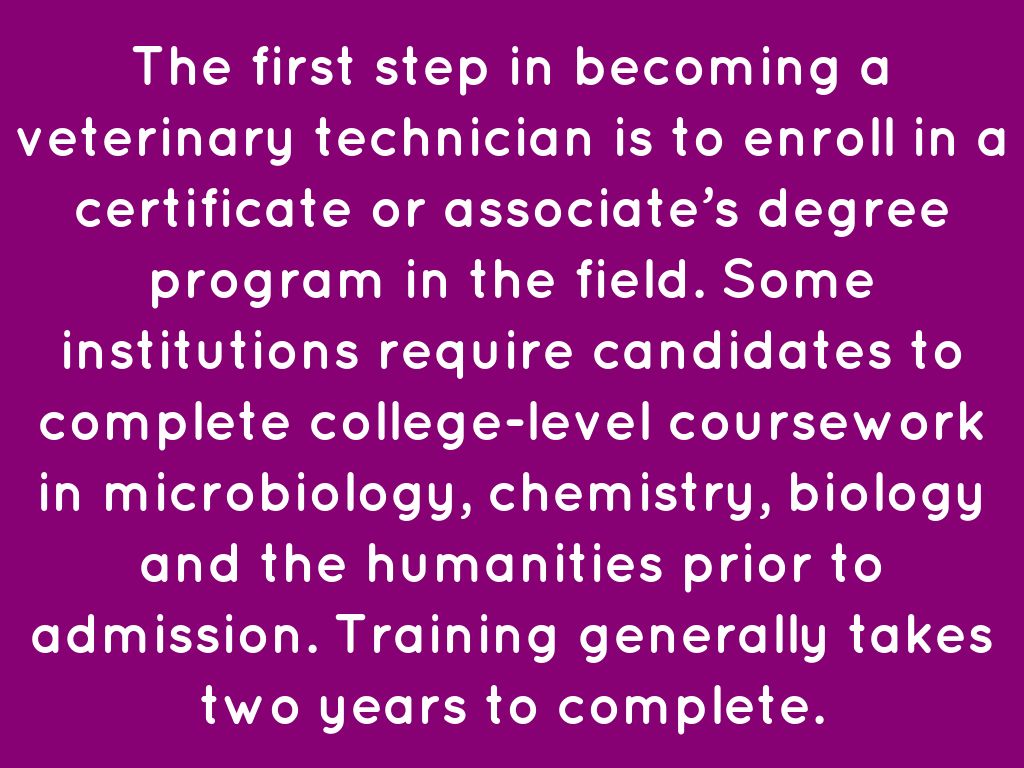 The first step in becoming a veterinary technician is to enroll in a certificate or associate’s degree program in the field. Some institutions require candidates to complete college-level coursework in microbiology, chemistry, biology and the humanities prior to admission. Training generally takes two years to complete.