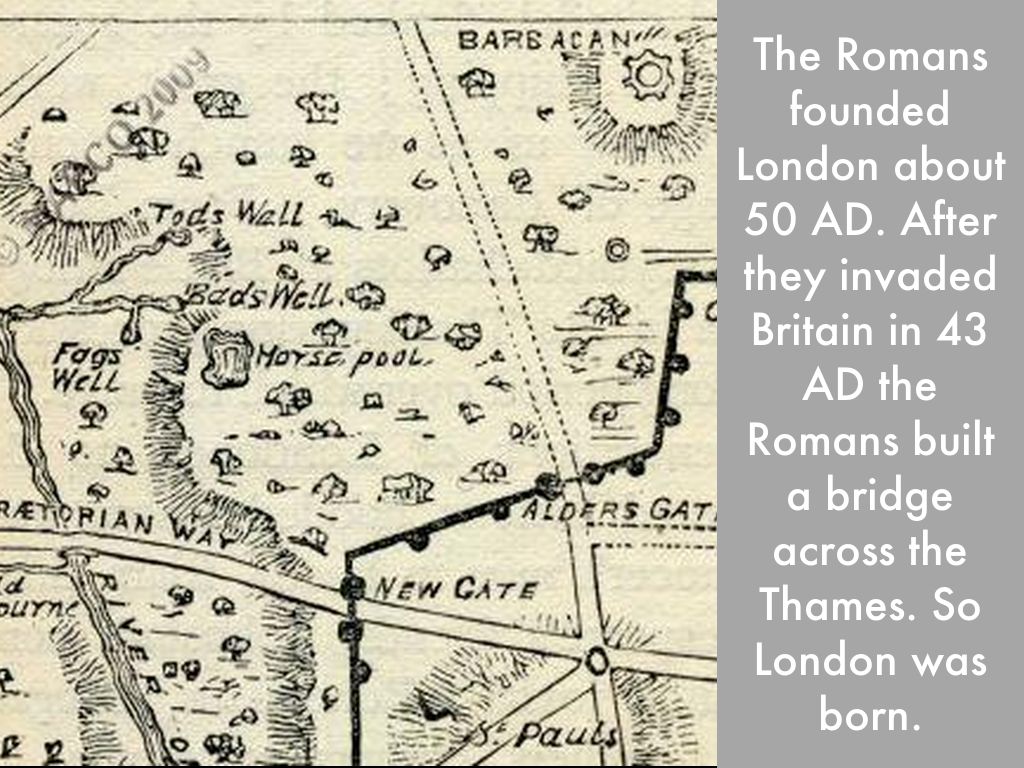 The Romans founded London about 50 AD. After they invaded Britain in 43 AD the Romans built a bridge across the Thames. So London was born.