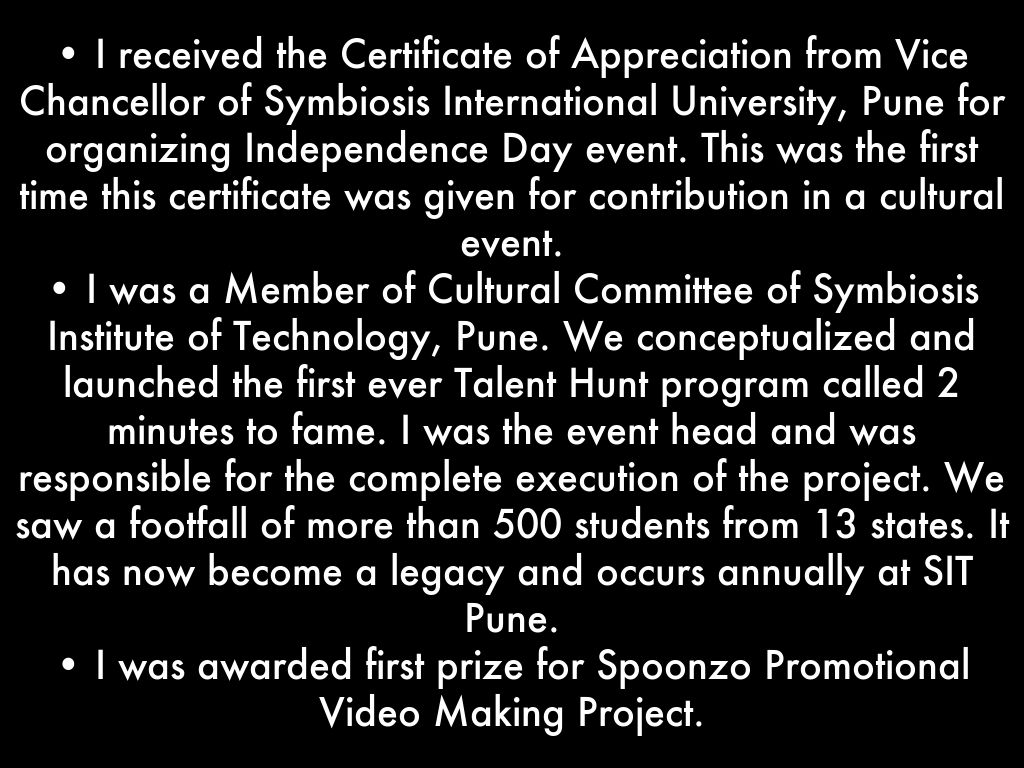 • I was a Member of Cultural Committee of Symbiosis Institute of Technology, Pune. We conceptualized and launched the first ever Talent Hunt program called 2 minutes to fame. I was the event head and was responsible for the complete execution of the project. We saw a footfall of more than 500 students from 13 states. It has now become a legacy and occurs annually at SIT Pune.