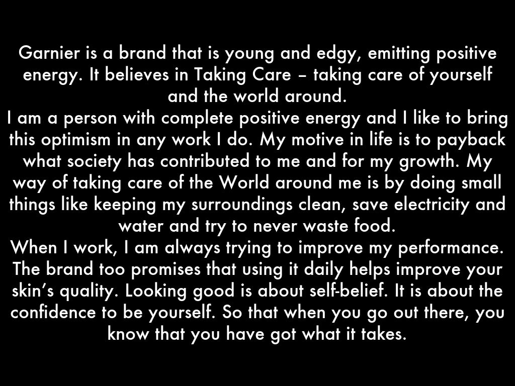 Garnier is a brand that is young and edgy, emitting positive energy. It believes in Taking Care – taking care of yourself and the world around.