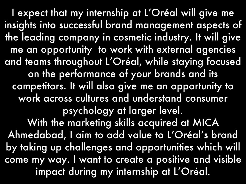 I expect that my internship at L’Oréal will give me insights into successful brand management aspects of the leading company in cosmetic industry. It will give me an opportunity to work with external agencies and teams throughout L’Oréal, while staying focused on the performance of your brands and its competitors. It will also give me an opportunity to work across cultures and understand consumer psychology at larger level.