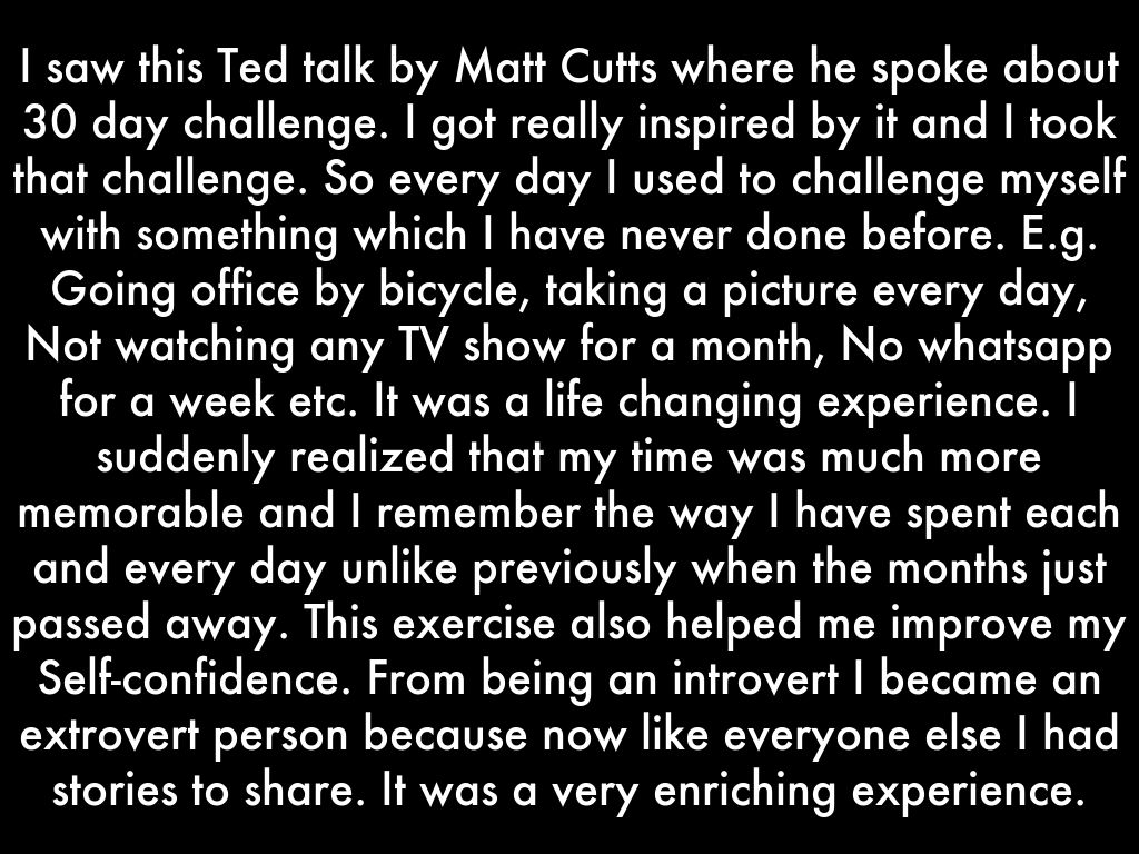 I saw this Ted talk by Matt Cutts where he spoke about 30 day challenge. I got really inspired by it and I took that challenge. So every day I used to challenge myself with something which I have never done before. E.g. Going office by bicycle, taking a picture every day, Not watching any TV show for a month, No whatsapp for a week etc. It was a life changing experience. I suddenly realized that my time was much more memorable and I remember the way I have spent each and every day unlike previously when the months just passed away. This exercise also helped me improve my Self-confidence. From being an introvert I became an extrovert person because now like everyone else I had stories to share. It was a very enriching experience.