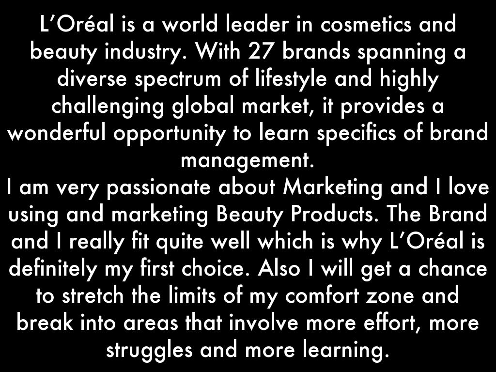 I am very passionate about Marketing and I love using and marketing Beauty Products. The Brand and I really fit quite well which is why L’Oréal is definitely my first choice. Also I will get a chance to stretch the limits of my comfort zone and break into areas that involve more effort, more struggles and more learning.