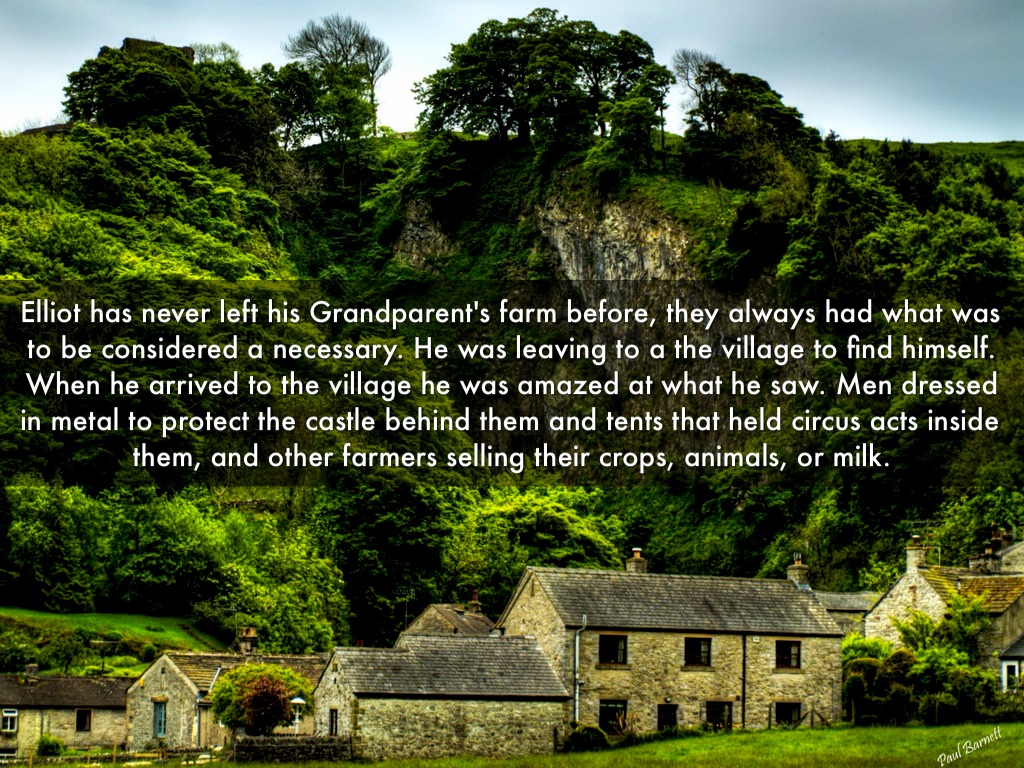 Elliot has never left his Grandparent's farm before, they always had what was to be considered a necessary. He was leaving to a the village to find himself. When he arrived to the village he was amazed at what he saw. Men dressed in metal to protect the castle behind them and tents that held circus acts inside them, and other farmers selling their crops, animals, or milk.