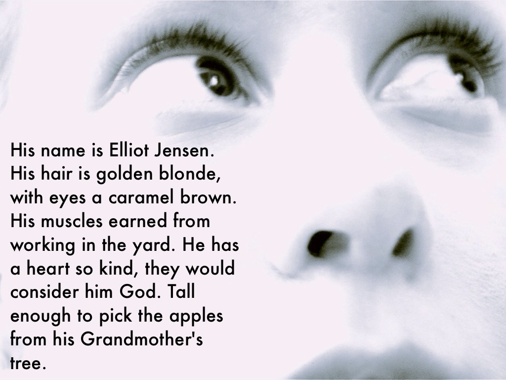 His name is Elliot Jensen. His hair is golden blonde, with eyes a caramel brown. His muscles earned from working in the yard. He has a heart so kind, they would consider him God. Tall enough to pick the apples from his Grandmother's tree.