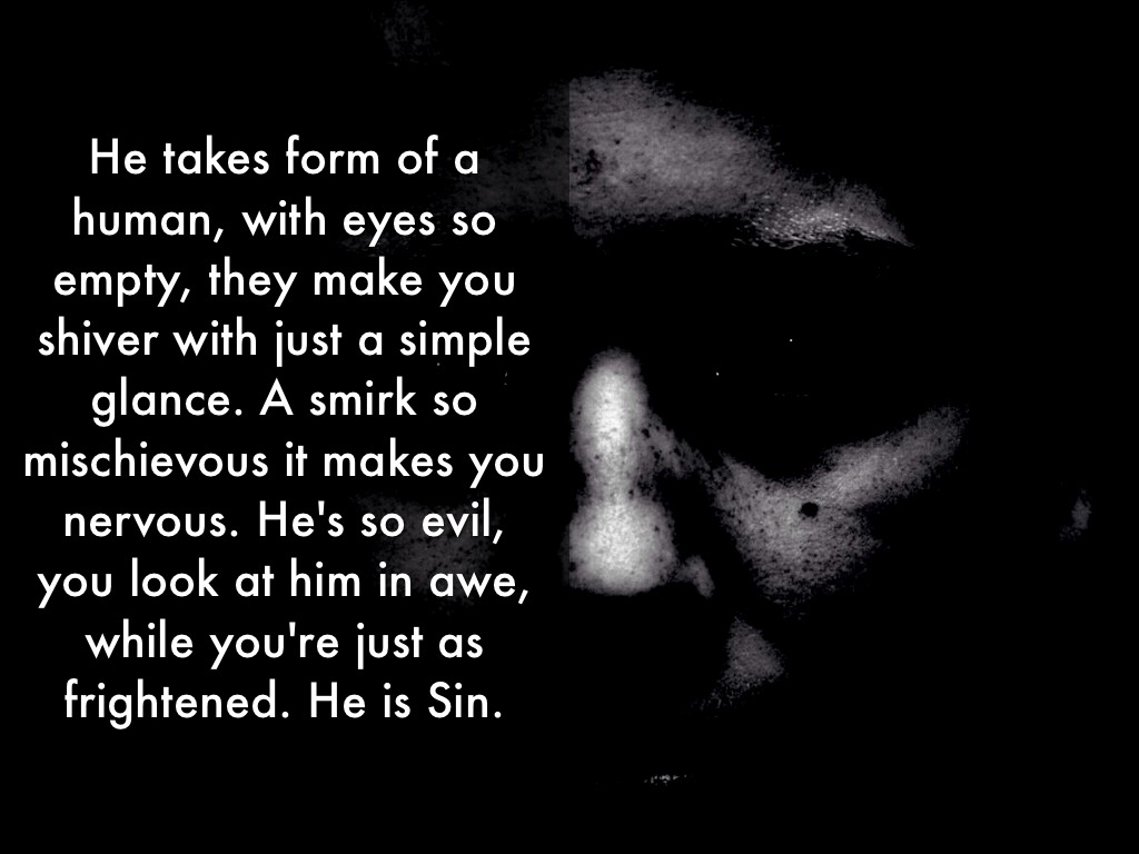 He takes form of a human, with eyes so empty, they make you shiver with just a simple glance. A smirk so mischievous it makes you nervous. He's so evil, you look at him in awe, while you're just as frightened. He is Sin.