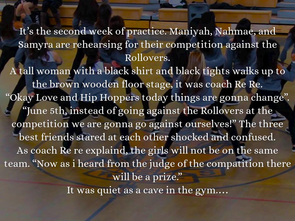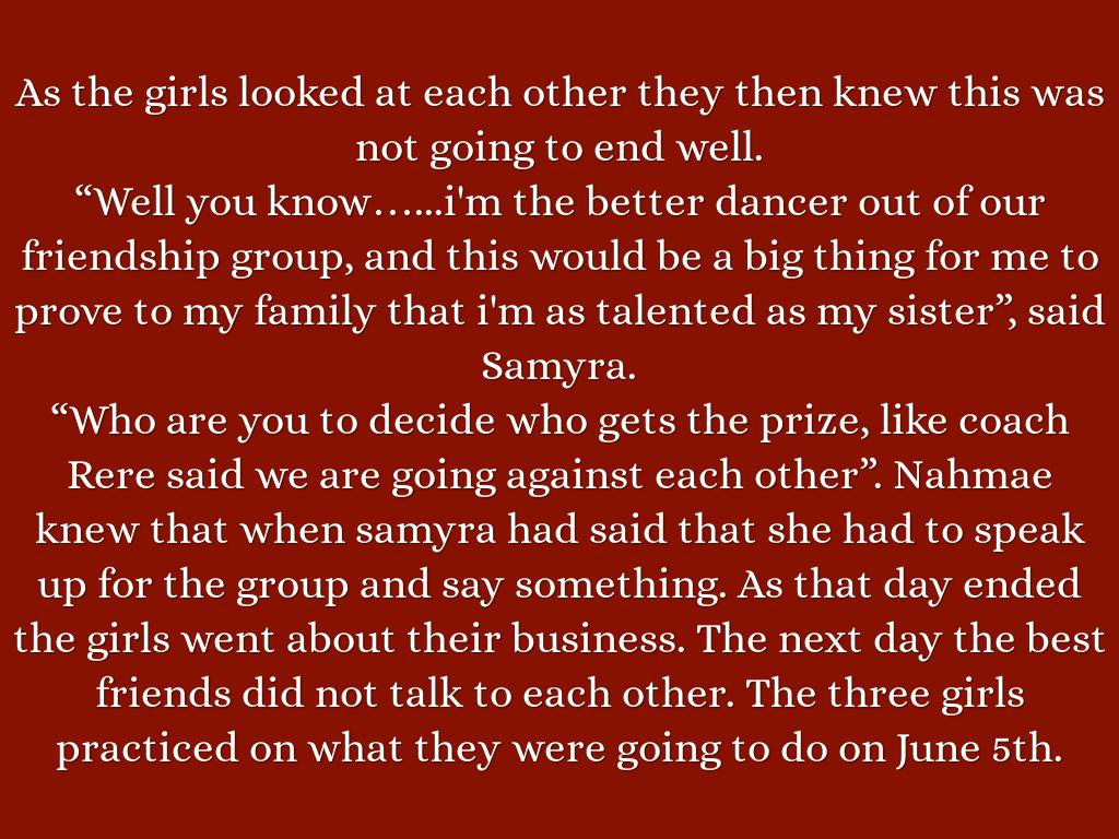 “Who are you to decide who gets the prize, like coach Rere said we are going against each other”. Nahmae knew that when samyra had said that she had to speak up for the group and say something. As that day ended the girls went about their business. The next day the best friends did not talk to each other. The three girls practiced on what they were going to do on June 5th.