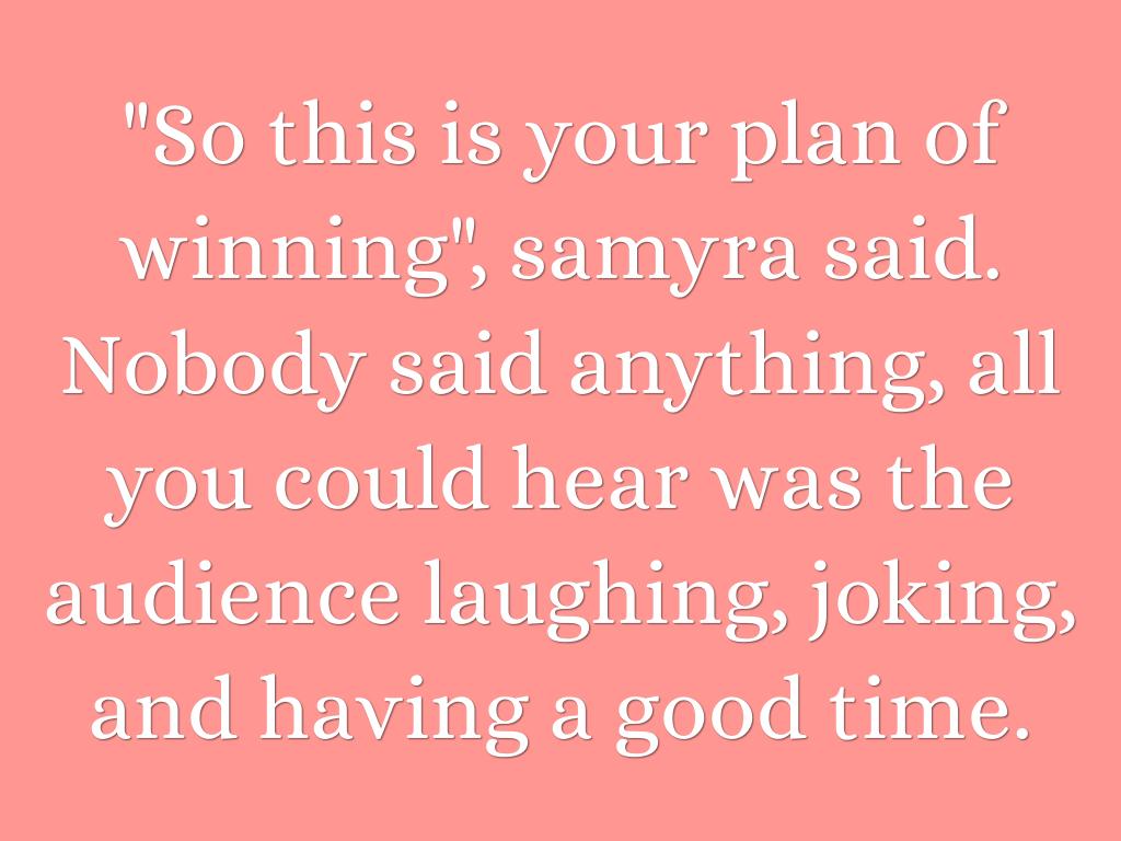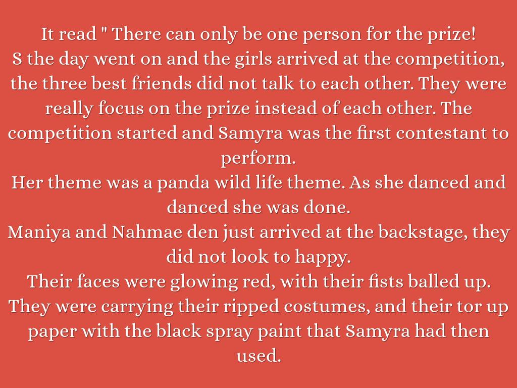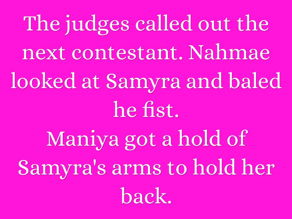 S the day went on and the girls arrived at the competition, the three best friends did not talk to each other. They were really focus on the prize instead of each other. The competition started and Samyra was the first contestant to perform.